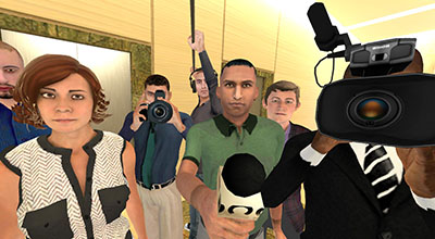 Experience being ambushed by the media in a hotel lobby and practice answering hostile questions.