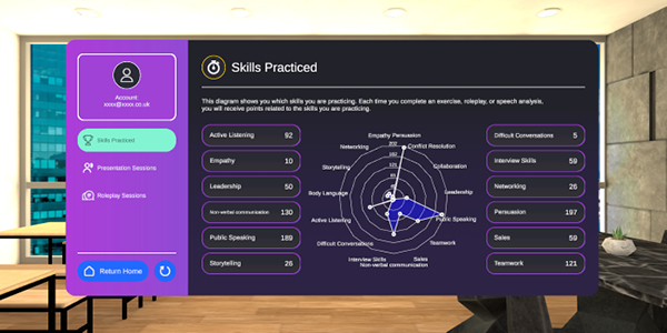 - Using proprietary algorithms, AI, and sentiment analysis, see how performance in VirtualSpeech relates to real-life soft skills like communication, active listening, storytelling, and leadership.